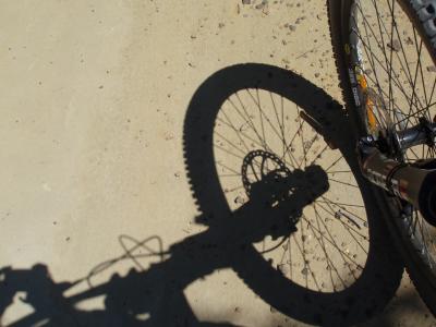 Looking down at the wheel and shadow of a downhill mountain bike on a dirt track