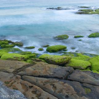 a long exposure seascape creates a tranquil effect with cyan blue water and moss covered stones on the shore