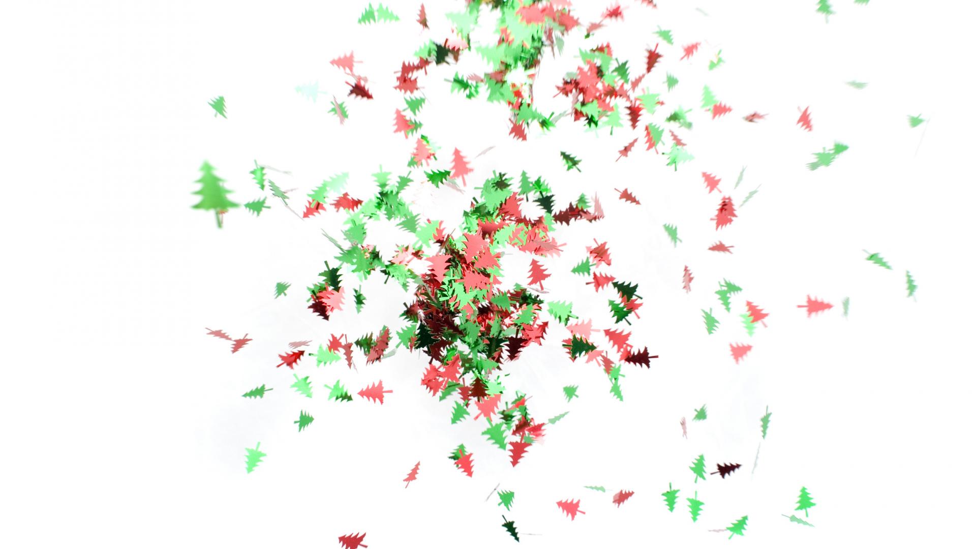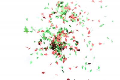 an unusual desktop background of red and green Christmas tree shaped confetti in motion