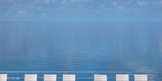 A row of sun loungers and an endless blue sky over the water