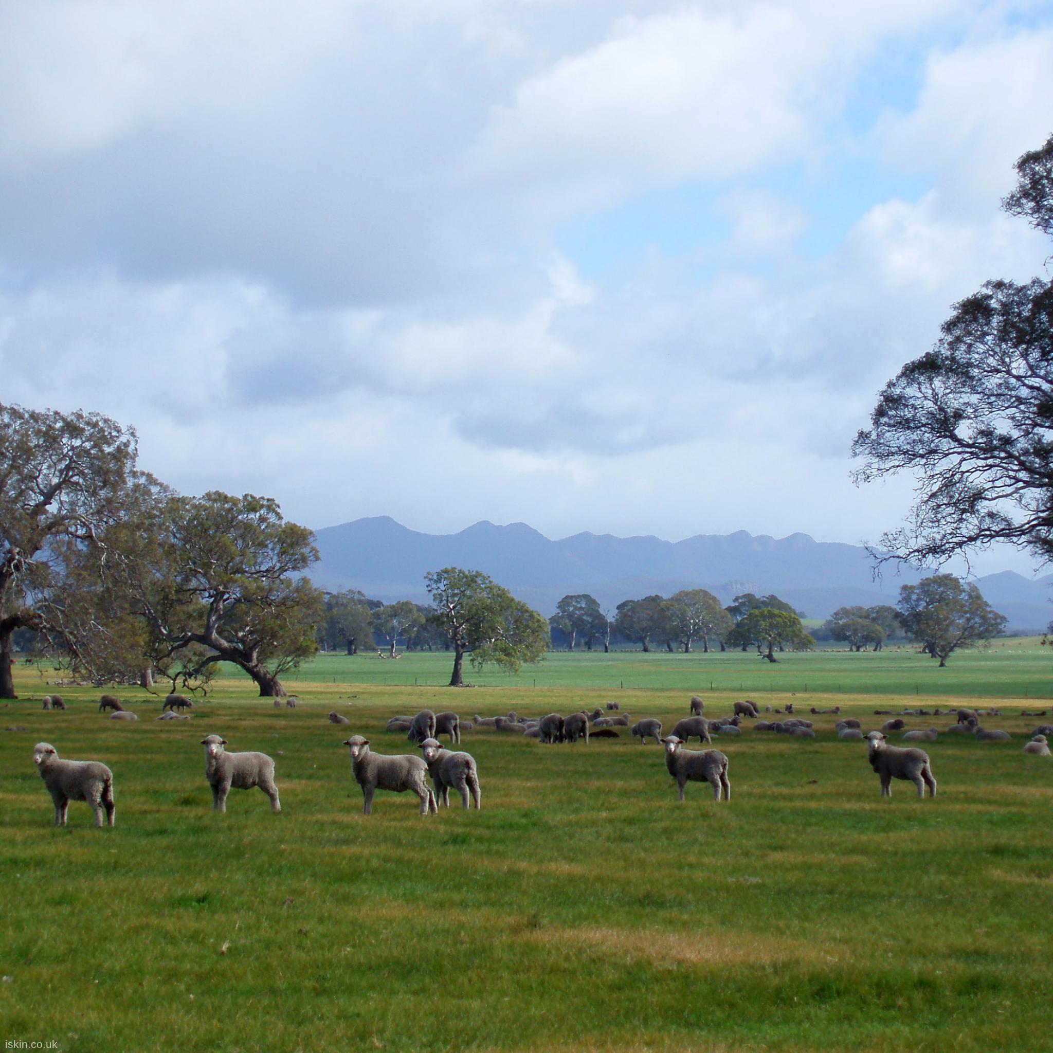 Sheep grazing on grassy plans below the Grampians range, rural Victroia, Australia