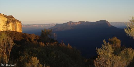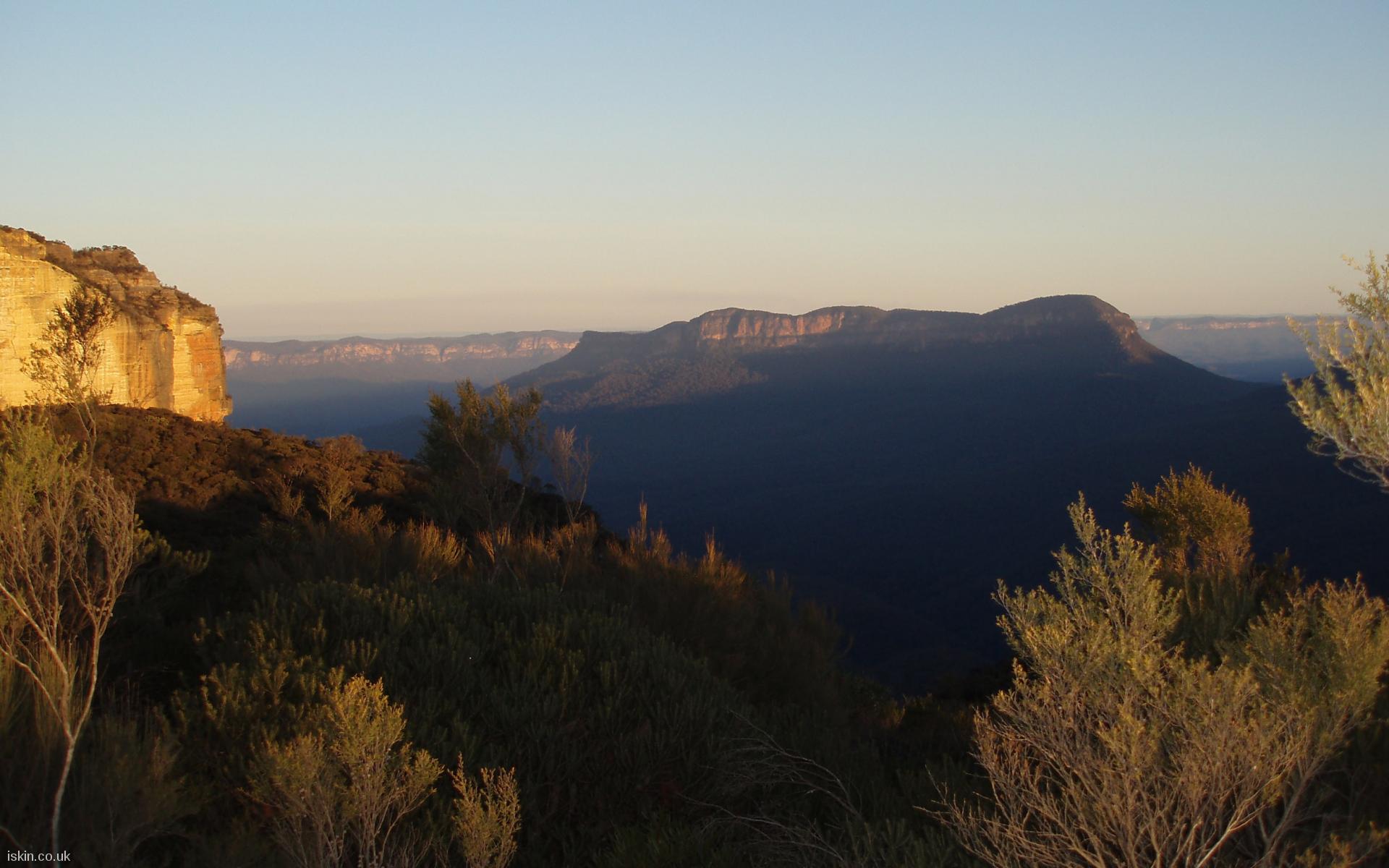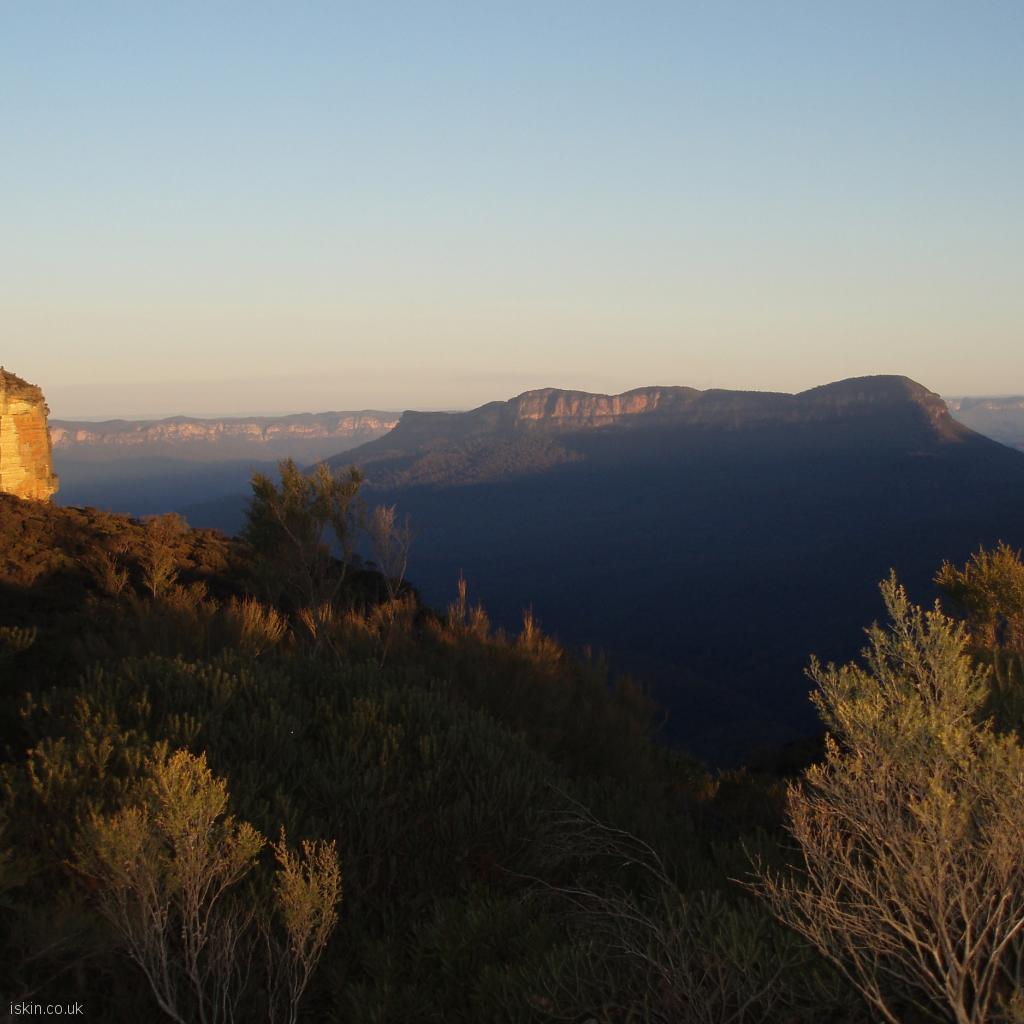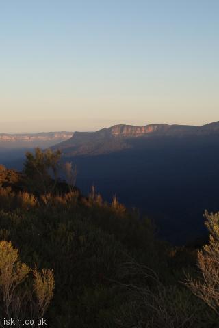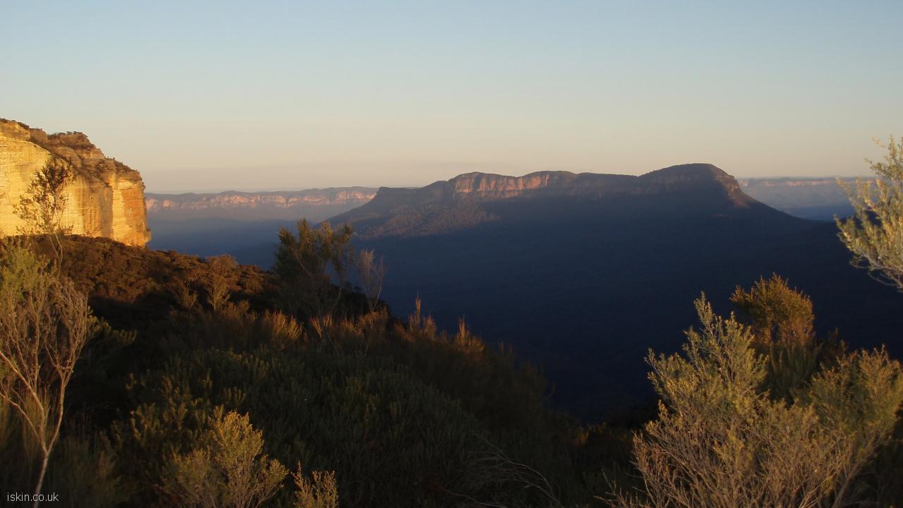 Golden colours of sunset in Australia's blue mountains as viewed from 'narrow neck'