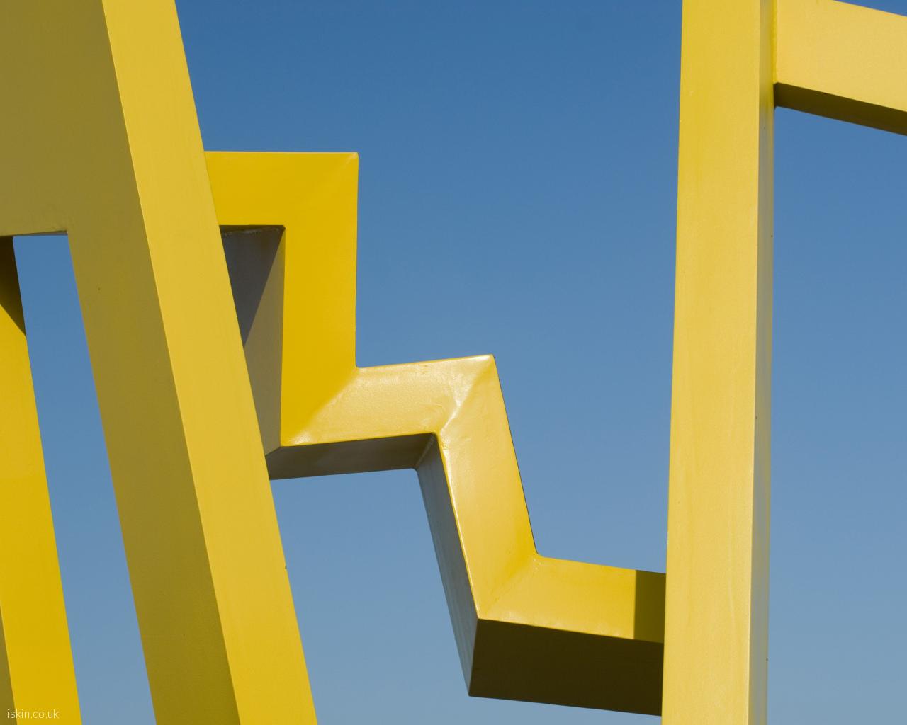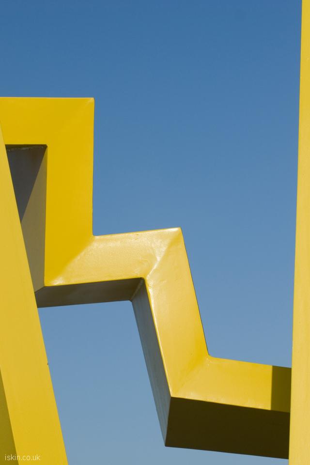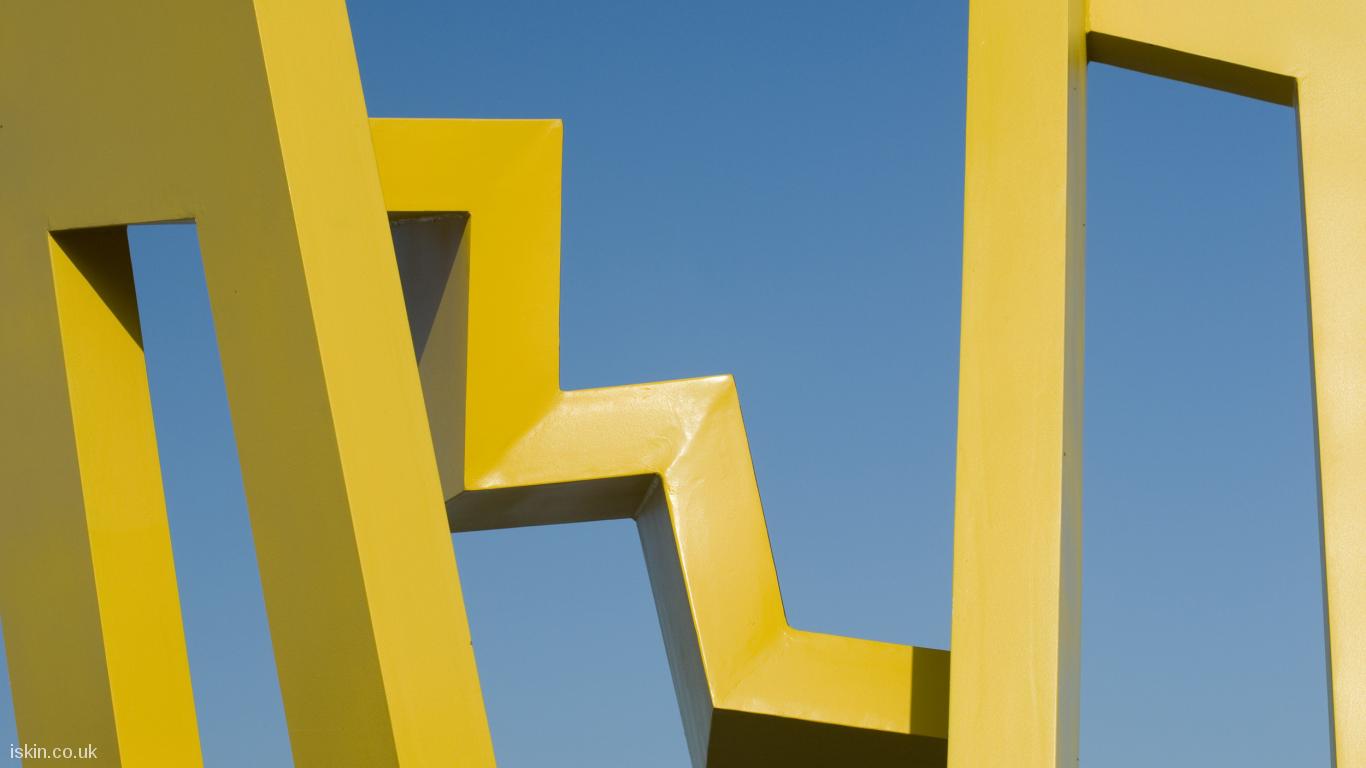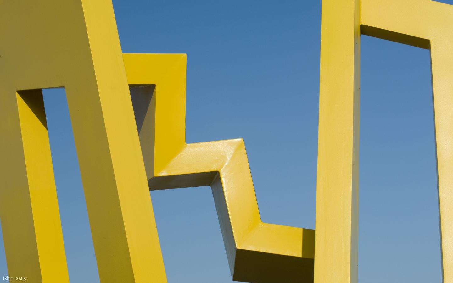 Sculpture by the sea 2007, Flight of Ideas by Linda Bowden, yellow sculpture against a blue sky background