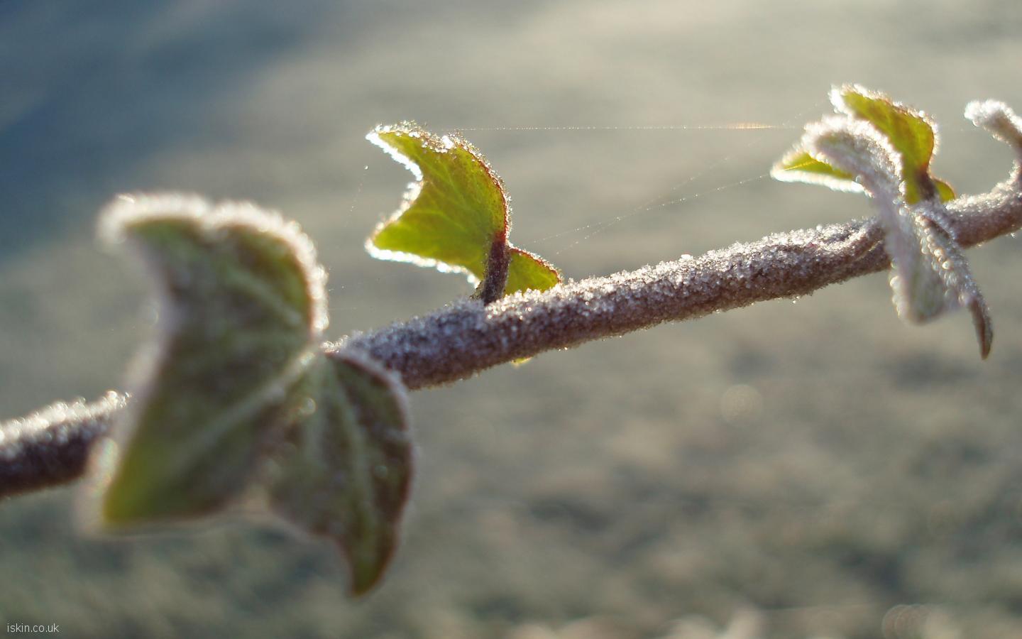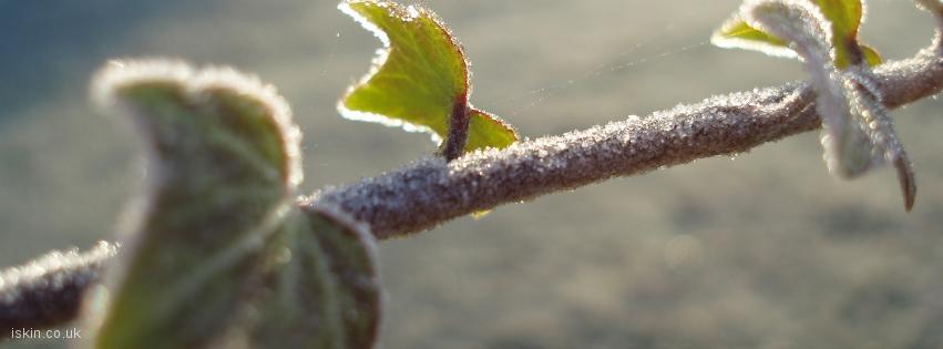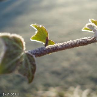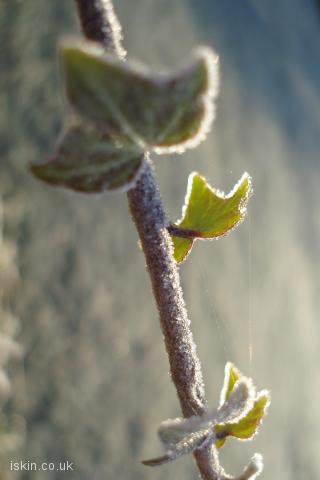 Macro image of frost crystals and tiny filaments of spider web glinting in the winter morning light